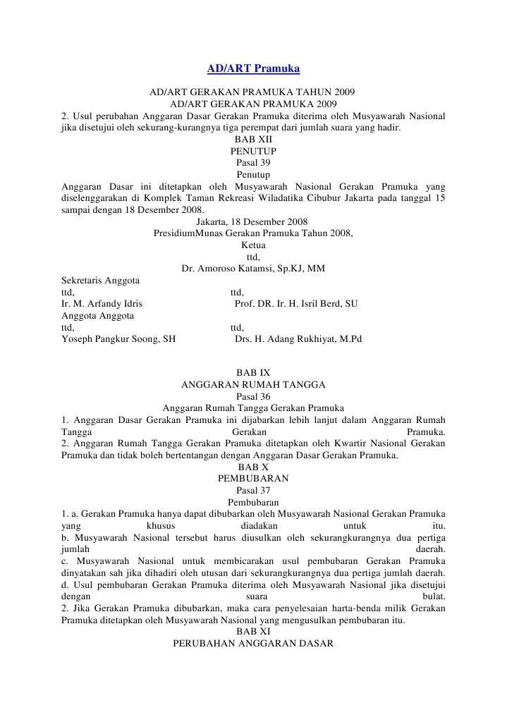 Anggaran dasar gerakan pramuka hasil munas 2013 terdiri atas 12 bab dan 62 pasal. Ad art gerakan pramuka indonesia. Anggaran dasar gerakan pramuka · 1) beriman dan bertakwa kepada tuhan yang maha esa, kuat mental, emosional, dan tinggi moral · 2) tinggi kecerdasan dan mutu . Melimpahkan wewenang kepada kwartir nasional. Pasal 1 (1) organisasi ini bernama gerakan pramuka.
