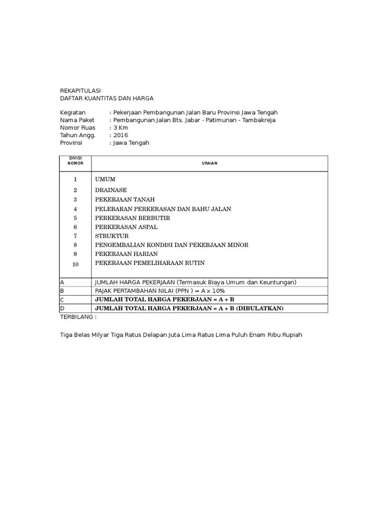 Rencana anggaran biaya kegiatan : Rencana anggaran biaya atau disingkat rab adalah perkiraan total biaya yang digunakan untuk melaksanakan suatu pekerjaan tertentu dalam bidang konstruksi. 6 aspal penetrasi 60/70 155kg drum rp 1,700,000.00 rp 1,504,400.00 rp 10,967.74 /kg Pembangunan pengaspalan jalan lokasi : Perancangan geometrik jalan,tebal perkerasan dan. Aspal terbuat dari bahan hidro karbon yang memiliki sifat melekat (adhesive) berwarna hitam kecoklatan, tahan terhadap air, dan visoelastis (wikipedia). Dalam contoh berikut adalah rab pengaspalan jalan dengan panjang jalan 1633 meter dan lebar 3 meter. Perkerasan berbutir dan divisi 6 perkerasan aspal. Pada perkerjaan jalan dibutuhkan suatu analisis rencana anggaran biaya, agar. Untuk menghitung rab pengaspalan hotmix tidaklah sulit, namun tetap harus dibuat sebuah perencanaan yang matang, berikut kontraktor jalan . Perkerasan aspal 5.1 (1) lapis resap pengikat ltr 66.86 13,397.00 . Rincian anggaran biaya ( rab ) pembuatan jalan baru per meter persegi, harga bembuatan jalan aspal hotmix terbaru, pengecoran jalan beton ready mix. Contoh reancana anggaran biaya pengaspalan jalan by bockiet.